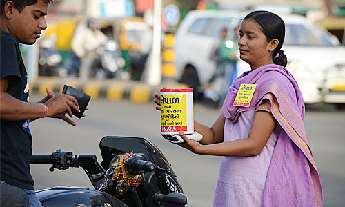 Εθελόντρια από φιλανθρωπική οργάνωση στην Ινδία συγκεντώνει χρήματα από πολίτες του Αχμενταμπάντ, τα οποία θα προσφερθούν στα θύματα του σεισμού.