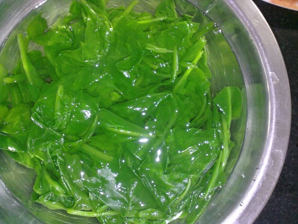 Όσο το σπανάκι μουλιάζει στο καθαρό νερό ή όσο περιμένετε να κρυώσει, μπορείτε να φτιάξετε τη σάλτσα. Σε μια μικρή κατσαρόλα, ρίξτε το λάδι και τσιγαρίστε το σκόρδο μέχρι να ροδίσει και να ελευθερωθεί το άρωμά του.