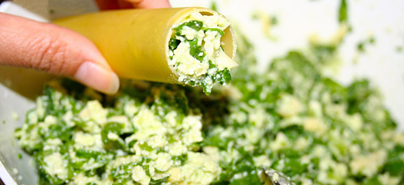 Αφού ανακατέψετε καλά, γεμίστε ένα ένα τα κανελόνια χρησιμοποιώντας ένα κουτάλι.