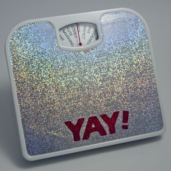 Χίλια μπράβο στον εμπνευστή, τον σχεδιαστή και τον κατασκευαστή. Η ζυγαριά αυτή -εκτός του ότι είναι καλυμμένη με γκλίτερ (!)- δεν γράφει κιλά, γράφει μόνο: "Αξιολάτρευτη", "Μια χαρά!", "Σέξι" και άλλα "ανεβαστικά" επίθετα. Μπορείτε να την αγοράσετε από εδώ (Τιμή: 40 ευρώ).