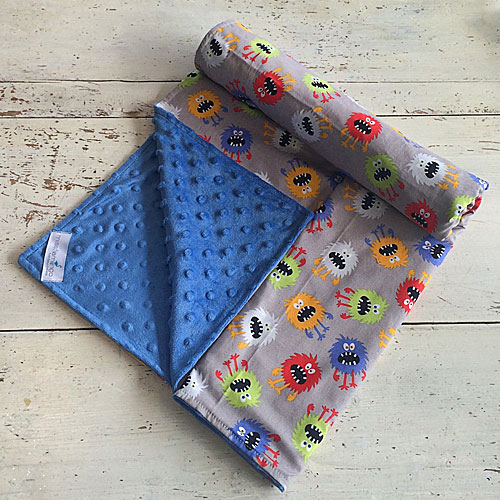 Υπέροχο κουβερτάκι, από 100% βαμβάκι, με πολύχρωμα χαριτωμένα τερατάκια από τη μία μεριά και πολύ μαλακό μπλε μίνκι φλιζ ύφασμα από την άλλη.