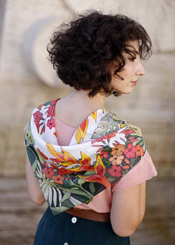 Ένα απλό καλοκαιρινό look αναβαθμίζεται με ένα κοντό φλοράλ μαντήλι στον λαιμό.