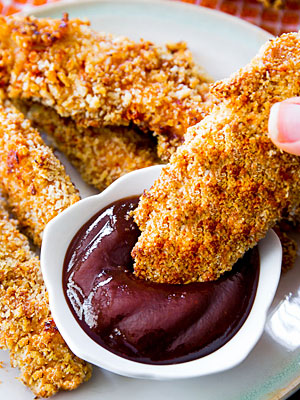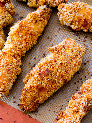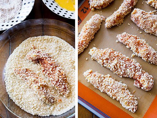 «Περάστε» την κάθε λωρίδα κοτόπουλο πρώτα από το πιάτο με το αλεύρι, τινάζοντας όσο περισσεύει, έπειτα από το πιάτο με τα αυγά και έπειτα από το πιάτο με το τρίμμα φρυγανιάς, ξανά τινάζοντας ό,τι περισσεύει. Προσθέτετε κάθε φορά στα πιάτα ό,τι υλικό τελειώνει για να φτάσει για όλο το κοτόπουλο (π.χ. αλεύρι ή φρυγανιά).