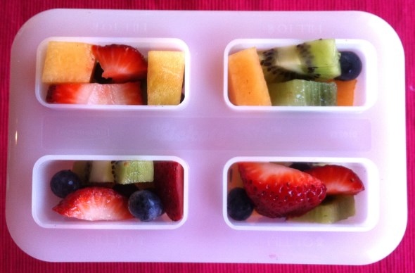 Σε ένα μεγάλο μπολ αναμείξτε όλα τα κομμένα φρούτα και γεμίστε τις θήκες γρανίτας. Παράλληλα, στύψτε ενάμιση φλιτζάνι φρέσκο χυμό από τα φρούτα της επιλογής σας.