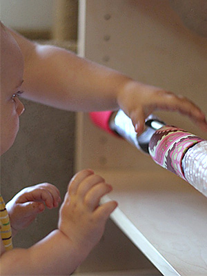 Ντύστε με πολύχρωμα χαρτιά/πανιά ή ζωγραφίστε τα ρολό του χαρτιού υγείας και περάστε τα σε έναν σπάγγο. Δέστε τις άκρες του σπάγγου σε ένα σταθερό σημείο (π.χ. στα πόδια μιας καρέκλας) και δείξτε στο μωρό το καινούριο παιχνίδι με τους χρωματιστούς κυλίνδρους που γυρίζουν.