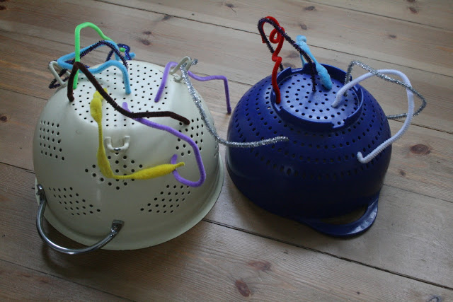 Δώστε στο παιδί ένα πλαστικό σουρωτήρι και μερικά πολύχρωμα καθαριστικά πίπας (θα τα βρείτε σε καταστήματα με είδη χειροτεχνίας) και δείξτε του πώς να τα περνάει μέσα από τις τρύπες του σκεύους.