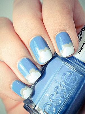 Με τρία -ή δύο- βερνίκια στις αποχρώσεις του γαλάζιου και του άσπρου ή του γκρι, μπορείτε να φτιάξετε υπέροχα συννεφάκια. Περάστε τα νύχια σας με το γαλάζιο βερνίκι-ουρανό, αφήστε το να στεγνώσει και με εργαλείο ένα τσιμπιδάκι μαλλιών -η άκρη τους είναι στρογγυλεμένη και λειτουργεί τέλεια σαν πινέλο- φτιάξτε τρεις άσπρες μικρές βούλες, που ενωμένες θα μοιάζουν με σύννεφο.