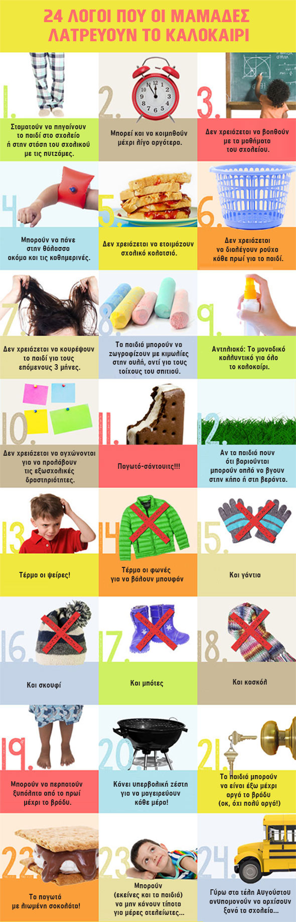 Μόνο και μόνο το γεγονός ότι έκλεισαν τα σχολεία είναι αρκετό για να είναι κάθε μαμά χαρούμενη που ήρθε το καλοκαίρι! Το παρακάτω πινακάκι συγκεντρώνει μερικούς απόλυτα ρεαλιστικούς λόγους που είναι τέλειο να είσαι μαμά το καλοκαίρι, με τους οποίους σίγουρα θα ταυτιστείτε...