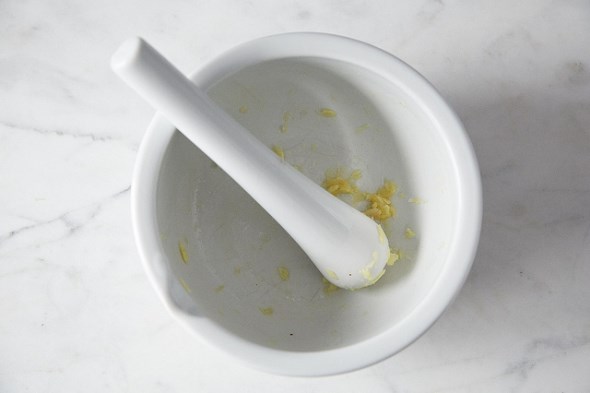 Λιώστε τις τρεις σκελίδες σκόρδου στο γουδί ή συνθλίψτε τις με ένα πιρούνι ή κουτάλι αφού τις ψιλοκόψετε.