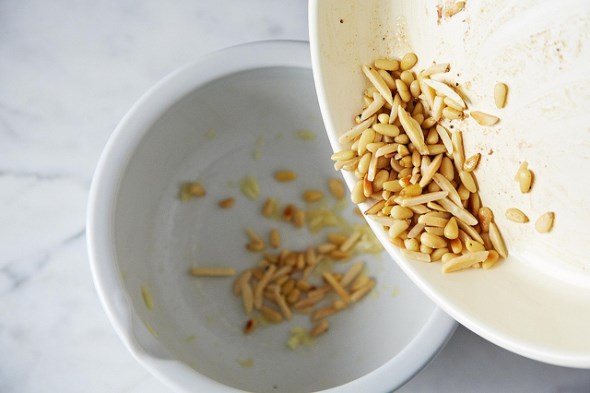 Βάλτε για λίγο το κουκουνάρι σε ένα αντικολλητικό τηγάνι μέχρι να ροδίσει, ανακατεύοντας συνέχεια και ρίξτε το στο μπολ ή το μίξερ μαζί με την φρεσκοτριμμένη παρμεζάνα.
