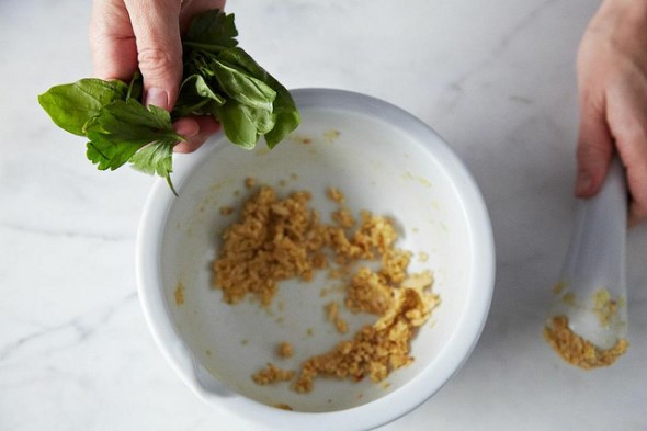 Πλύνετε και στεγνώστε καλά τα φύλλα του βασιλικού και φροντίστε να απομακρύνετε τα κοτσάνια, για να μην πικρίσει η πέστο. Περάστε τα από το μίξερ για να πολτοποιηθούν και προσθέστε τα στο μπολ. Χτυπήστε όλα τα υλικά καλά στο γουδί.