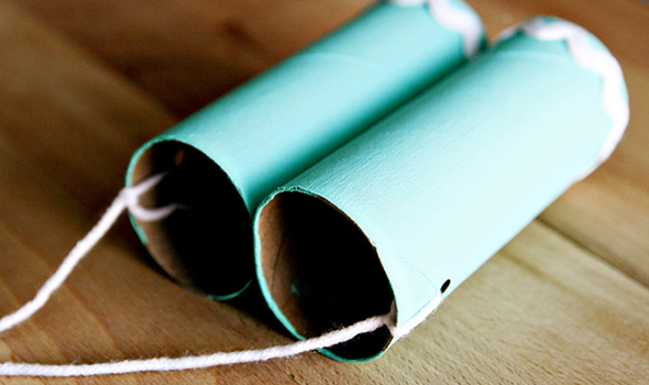 Ξεκινήστε βάφοντας τα δύο ρολά στο χρώμα που προτιμά το παιδί, με τις τέμπερες και τα πινέλα. Στη συνέχεια, αφήστε τα να στεγνώσουν. Μπορείτε να κολλήσετε στη μία άκρη του κάθε ρολού ένα διακοσμητικό σε σχήμα ζικ-ζακ, όπως στη φωτογραφία (μπορείτε να βρείτε και έτοιμες κορδέλες σε τέτοιο σχήμα, στα καταστήματα με ραπτικά είδη). Έπειτα, κολλήστε τα δύο ρολά μεταξύ τους, έτσι ώστε να σχηματίζουν κιάλια. Με ένα αιχμηρό αντικείμενο κάντε δύο μικρές τρυπούλες στην εξωτερική πλευρά από κάθε ρολό, μέσα από το οποίο θα περάσει το σχοινί, ώστε να μπορεί το παιδί να κρεμάσει τα κιάλια στον λαιμό του! Αφήστε το να εξερευνήσει τον κόσμο μέσα από τα φανταστικά του κιάλια!