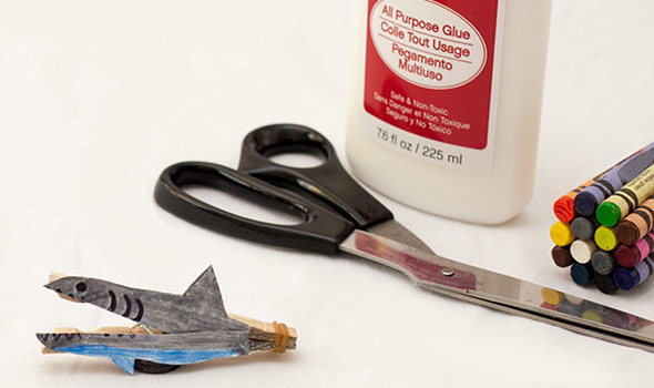 Στις λευκές κόλλες χαρτιού σχεδιάστε ψαράκια σε διάφορα σχέδια, π.χ. καρχαρίες ή ψάρια κλόουν, φροντίστε το μέγεθός τους να είναι μεγαλύτερο από αυτό που έχουν τα μανταλάκια, ώστε να τα καλύψουν όταν τα κολλήσετε στο πλάι. Στη συνέχεια κόψτε τα ψαράκια, οριζόντια στα δύο, ώστε να κολλήσετε το κάθε μέρος σε κάθε πλευρά από το μανταλάκι (όπως στη φωτογραφία). Στο τέλος, κολλήστε τα ψαράκια στα μανταλάκια έτσι ώστε το στόμα τους να είναι στο κάτω τμήμα.