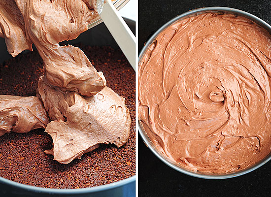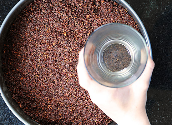Για τη βάση, θρυμματίστε καλά τα μπισκότα, στο μπλέντερ, και αναμείξτε τα σε ένα μπολ με 4 κουταλιές της σούπας σκόνη κακάο και το βούτυρο.
