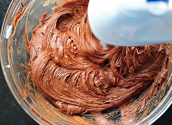 Για την κρέμα σοκολάτας, σε ένα μεγάλο μπολ «χτυπήστε» με το μίξερ χειρός το τυρί κρέμα, μέχρι να γίνει αρκετά απαλό και αφράτο.