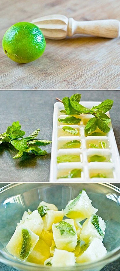 Στύψτε χυμό lime ή λεμόνι μέσα σε μία παγοθήκη και προσθέστε σε κάθε θήκη μερικά φύλλα δυόσμου. Τα παγάκια αυτά θα δροσίσουν με υπέροχη γεύση τα ποτά ή απλά το νερό σας!