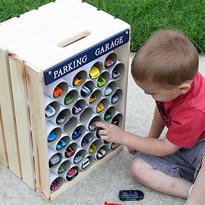 Να μια τέλεια λύση για να συμμαζεύει το παιδί τα αμέτρητα αυτοκινητάκια του! Μέσα σε ένα καφάσι, κολλήστε πολλά ρολά από χαρτί τουαλέτας, σε κάθε ένα εκ των οποίων το παιδί θα μπορεί να αποθηκεύει τα αυτοκινητάκια του! Βάλτε και μία ωραία πινακίδα, όπως στη φωτογραφία, για πιο... επαγγελματικό αποτέλεσμα!
