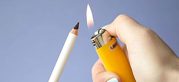 Θερμάνετε την άκρη του απλού μολυβιού ματιών με έναν αναπτήρα. Φροντίστε, όμως, να το κρατάτε λίγο πιο μακρυά από τον αναπτήρα για να μην υπερθερμανθεί η μύτη του και λιώσει. Πριν εφαρμόσετε στο μάτι, δοκιμάστε το στο χέρι για να ελέγξετε την θερμοκρασία του. Έτσι, θα πετύχετε το τέλειο υγρό αποτέλεσμα που θέλετε!