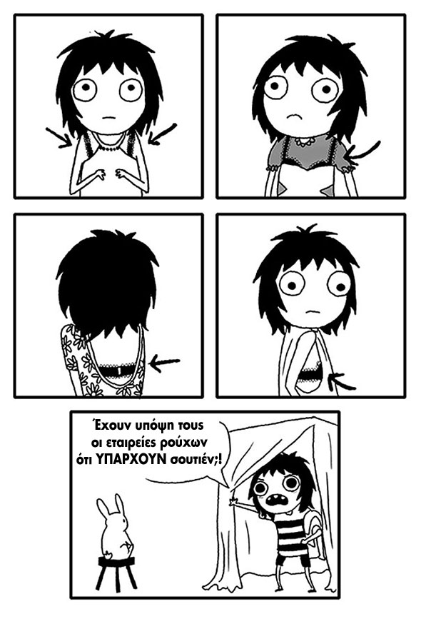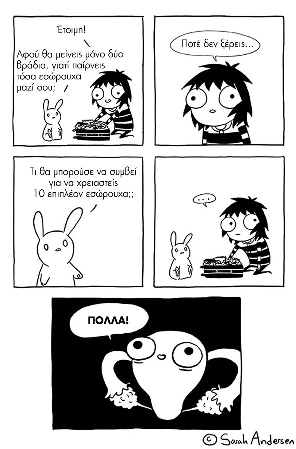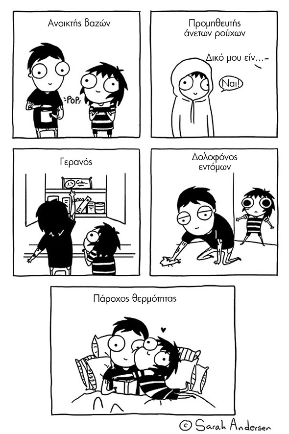 Η Sarah C. Anderson είναι μια σύγχρονη γυναίκα που σκιτσάρει όσα συμβαίνουν στην καθημερινότητα μιας… σύγχρονης γυναίκας. Τα κομιξάκια της είναι σχεδόν αυτοβιογραφικά και με χιούμορ και πολλή ευστοχία καταδεικνύουν τις δυσκολίες, τα προβλήματα και τις συνήθειες γένους θηλυκού. Εμείς διαλέξαμε τέσσερα από τα σκίτσα της και σας τα παρουσιάζουμε. Μπορείτε να βρείτε περισσότερα εδώ.