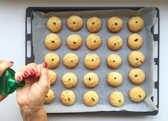 Μολις βγούνε, ραντίστε τους, όσο είναι ζεστοί, με ανθόνερο και αφήστε τους να κρυώσουν τελείως. Αν το ανθόνερο σας δεν είναι σε μορφή σπρέι, ρίξτε μικρή ποσότητα στην παλάμη σας και ραντίστε με τα δάχτυλά σας!