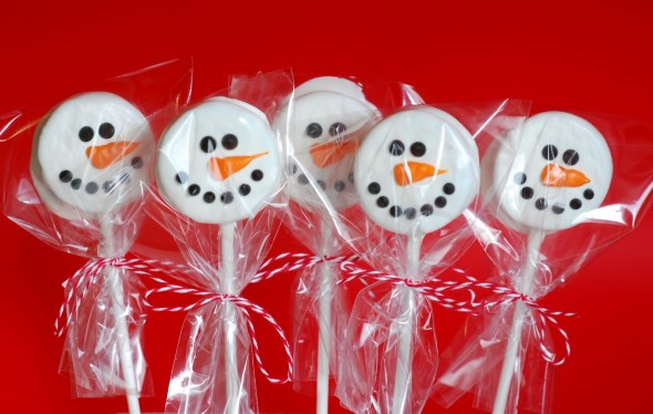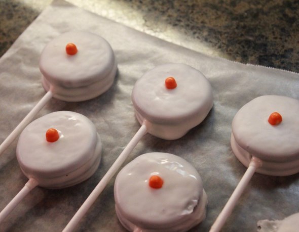 Πριν το γλάσο κρυώσει εντελώς -όσο είναι ακόμη μαλακό- πιέστε ελαφρά τις κομμένες καραμέλες στο κέντρο των μπισκότων για να σταθεροποιήσετε τις μύτες των χιονανθρώπων.