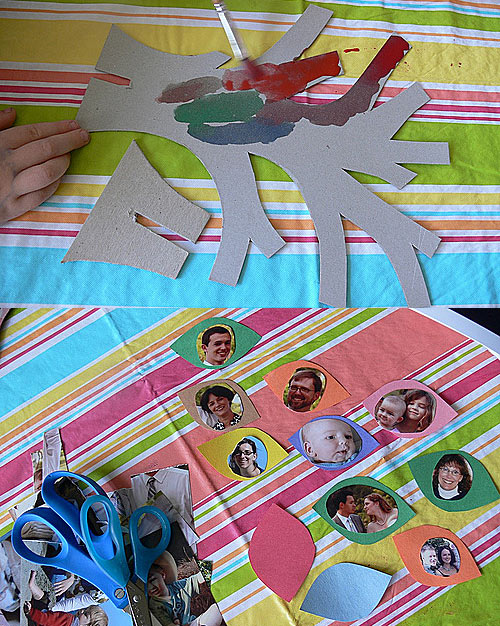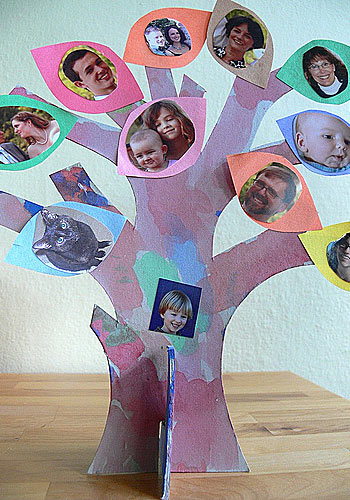 Πείτε στο παιδί να ζωγραφίσει πάνω στο χαρτόνι το περίγραμμα του κορμού ενός δέντρου και έπειτα να το κόψει. Στη βάση του, κόψτε μια λεπτή γραμμή για να βάλετε αργότερα ένα άλλο κομμάτι χαρτόνι που θα το στερεώσει. Έπειτα, το παιδί μπορεί να το χρωματίσει όπως θέλει και να κόψει τα φύλλα. Στη συνέχεια, θα κολλήσει τις φωτογραφίες πάνω τους και μετά εκείνα πάνω στο δέντρο. Στο κενό που έχετε αφήσει στη βάση του δέντρου, βάλτε ένα κομμάτι από πιο χοντρό χαρτόνι (που μπορείτε να κόψετε ακόμα και από ένα χαρτόκουτο) για να στερεωθεί καλύτερα η κατασκευή.