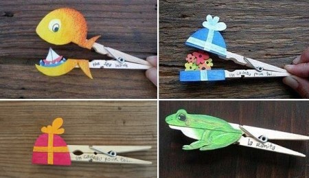 Στις λευκές κόλλες χαρτιού σχεδιάστε ψαράκια σε διάφορα σχέδια, π.χ. καρχαρίες ή ψάρια κλόουν και ό,τι άλλο μπορείτε να φανταστείτε, φροντίζοντας το μέγεθος τους να είναι αντίστοιχο μ' αυτό των μανταλακίων. Στη συνέχεια, κόψτε τα ψαράκια, τα ζωάκια ή τα αντικείμενα οριζόντια στα δύο, ώστε να κολλήσετε το κάθε μέρος σε κάθε πλευρά από το μανταλάκι (όπως στη φωτογραφία). Στο τέλος, κολλήστε τα στα μανταλάκια και τα παιχνιδομανταλάκια είναι έτοιμα!