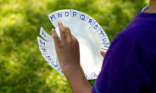 Σχηματίστε με το μαρκαδόρο τα γράμματα της αλφαβήτας πάνω στο πιάτο και έπειτα κόψτε τα μέχρι το ύψος της μέσης τους με το ψαλίδι. Έπειτα δώστε το στο παιδί και ρωτήστε το, για παράδειγμα, να διπλώσει τα γράμματα του ονόματός του. Διαφορετικά κάντε το ίδιο για ένα- ένα γράμμα.