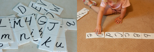 Κόψτε ίσα, μακρόστενα κομμάτια του χαρτονιού και στη συνέχεια χωρίστε το καθένα απ' αυτά στη μέση με μια λεπτή γραμμή από μολύβι. Στην πάνω μεριά αρχίστε με το κεφαλαίο Α και από κάτω σχηματίστε το μικρό β. Στο επόμενο κομμάτι, συνεχίστε με το κεφαλαίο Β και με το μικρό γ. Συνεχίστε σ' αυτό το μοτίβο με το κάτω μέρος της καρτέλας να έχει το μικρό γράμμα και το κεφαλαίο του να είναι στο πάνω μέρος της αμέσως επόμενης. Έπειτα, κάντε ανά πεντάδες μάθημα στο παιδί και στη συνέχεια ζητήστε του να τα βάλεις τη σειρά.