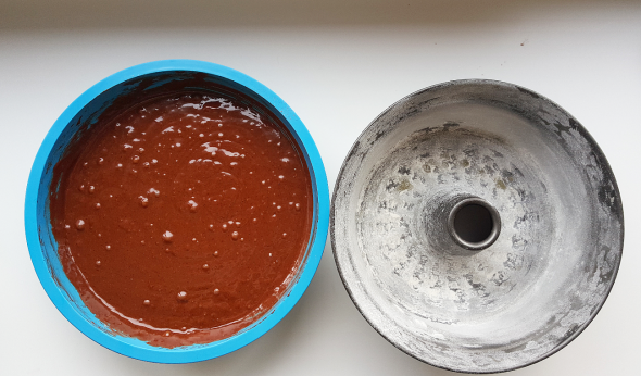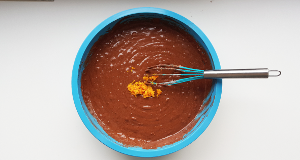 Ανακατέψτε το αλεύρι με το κακάο και το μπέικιν σε ένα άλλο μπολ και προσθέστε το στο υγρό μείγμα.