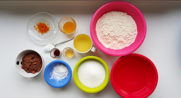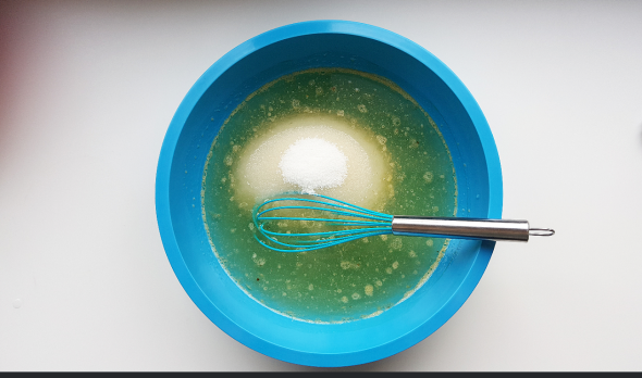 Σε ένα μπολ ανακατέψτε το νερό με την ζάχαρη, τη βανίλια, το λάδι και το ξύδι.