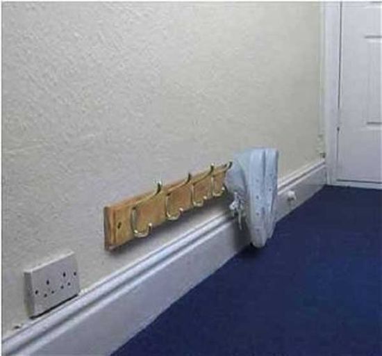 Μια έξυπνη ιδέα για όσους φοράνε τα παπούτσια τους αμέσως πριν φύγουν από το σπίτι, είναι να στερεώσετε μια κρεμάστρα για παλτό στο κάτω μέρος του τοίχου δίπλα στην πόρτα και να τα κρεμάσετε εκεί.