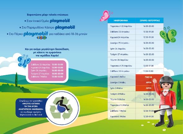 Από τις 22 Απριλίου έως τις 8 Μαΐου, τρεις ξεχωριστοί, καινούργιοι παιδότοποι περιμένουν παιδιά κάθε ηλικίας, ακόμη και από 18 μηνών, για ατελείωτο παιχνίδι: Ο Ιππικός Όμιλος, το Παραμυθένιο Κάστρο και ο Παιδότοπος 123 και Guest star η νεράιδα Χαρά. Ακόμα, οι μικροί μας φίλοι θα μπορούν να διεκδικήσουν πλούσια δώρα Playmobil!