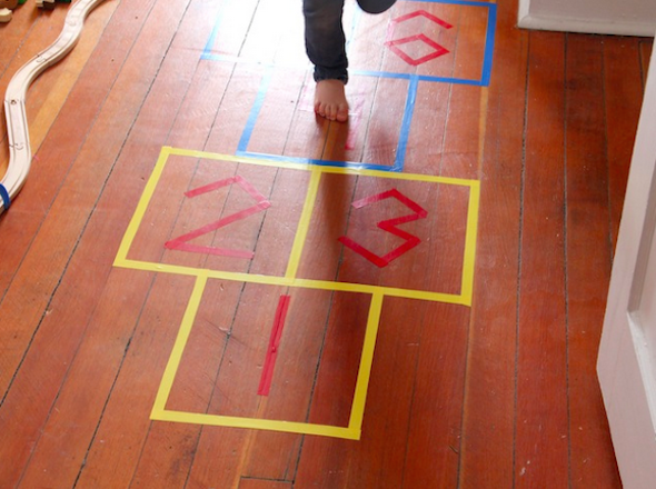 Ποιος είπε ότι δεν μπορούμε να παίξουμε κουτσό μέσα στο σπίτι; Για να το φτιάξετε θα χρειαστεί να προμηθευτείτε αυτοκόλλητα ρολά απ’ το βιβλιοπωλείο της γειτονιάς σας, να τα κόψετε και να τα κολλήσετε στο πάτωμα. Ίσως μπείτε στον πειρασμό να θυμηθείτε τα δικά σας παιδικά χρόνια και να εγκαινιάσετε εσείς το παιχνίδι.