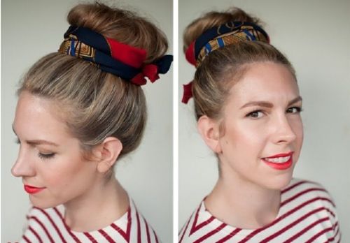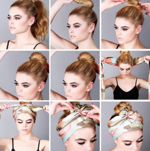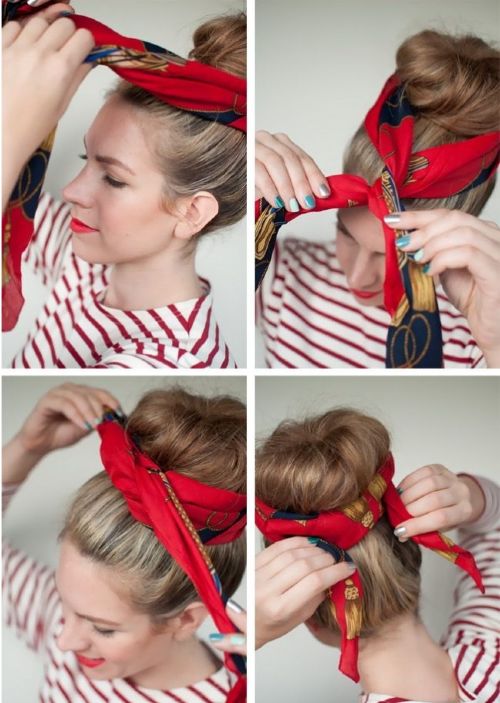 Βλέποντας την εικόνα ενδεχομένως θυμάστε φωτογραφίες παλιών σταρ του Χόλιγουντ, που συνήθιζαν να… καλλωπίζουν μ’ αυτόν τον τρόπο την κόμη τους. Αν είστε λάτρης του vintage, πιάστε ένα ψηλό σινιόν και μετά τυλίξτε το φουλάρι μπροστά απ' αυτό σε χοντρές λωρίδες.