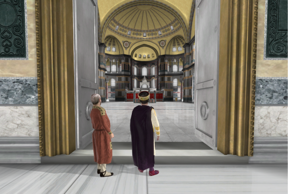 Ως αφετηρία της περιήγησης έχει επιλεχθεί η εξέλιξη της Αγίας Σοφίας από την Ιουστινιάνεια περίοδο (6ος αιώνας). Ουσιαστικά, χρησιμοποιείται το αρχιτεκτονικό μοντέλο του τέλους του 6ου αιώνα. Ταυτόχρονα, ανασυστάθηκε το μεγαλύτερο μέρος του εσωτερικού διακόσμου κατά την Κομνήνεια περίοδο (11ος-12ος αιώνας), όπως αυτός σωζόταν και αποκαλύφθηκε από την έρευνα μέχρι τα μέσα του 20ου αιώνα.