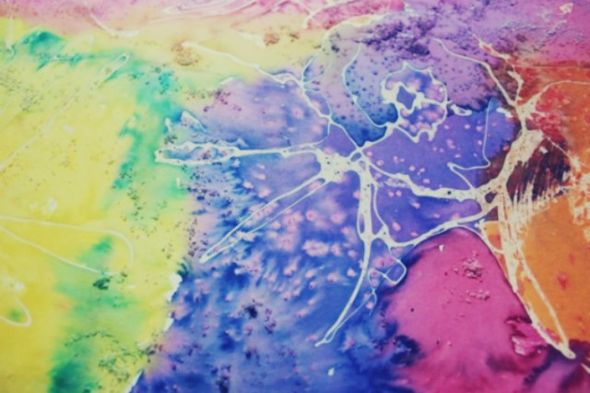 Ζωγραφίστε κάτι στο χαρτί ακουαρέλας με τις νερομπογιές σας, περάστε τη ζωγραφιά σας με νερό και, πριν στεγνώσει, στάξτε πιτσιλιές από διάφορα χρώματα ώστε να διαλυθούν και να αναμιχθούν σε κάτι πιο πολύχρωμο.
