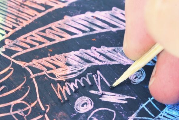 Πάρτε ένα κομμάτι χαρτί και βάψτε το πολύχρωμο με τα παστέλ μολύβια σας. Ανακατέψτε μαύρη τέμπερα με σαπούνι και καλύψτε όλη την επιφάνεια. Με κάτι αιχμηρό ή με το πίσω μέρος του πινέλου χαράξτε ότι σχέδιο θέλετε αποκαλύπτοντας λίγο-λίγο το πολύχρωμο υπόβαθρο.