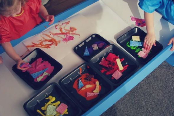 Πάρτε ένα σφουγγάρι και τις τέμπερές σας, βουτήξτε τον σπόγγο στο χρώμα και χρησιμοποιήστε τον στο χαρτί για να δημιουργήσετε πολύχρωμες πολυμορφικές ζωγραφιές.