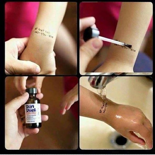 Με έναν μαρκαδόρο γράψτε σε εμφανές σημείο στο χέρι του παιδιού την φράση «Αν χαθώ, καλέστε εδώ:…» και δίπλα γράψτε το κινητό σας. Έπειτα, απλώστε από πάνω του τον επίδεσμο σε υγρή μορφή και αφήστε το να στεγνώσει. Επειδή το υγρό είναι αδιάβροχο, θα δημιουργήσει ένα προστατευτικό κάλυμμα πάνω από τα γράμματά σας κι έτσι δεν πρόκειται να σβηστούν.