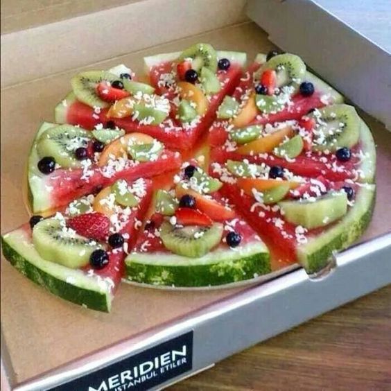 Μπορεί να μην έχει λιωμένο τυρί, μπέικον και ζουμερή σάλτσα ντομάτας, ομως από εμφάνιση αυτή η πίτσα... σκίζει. Χρησιμοποιήστε το καρπούζι για βάση και πάνω του προσθέστε έξτρα κομματάκια φρούτων. Απογειώστε την ιδέα, σερβίροντας την υγιεινή πίτσα στο κατάλληλο κουτί.