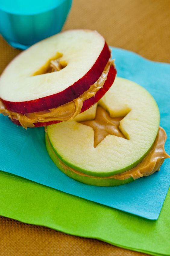 Για να γίνουν πιο ελκυστικά τα φρούτα, μπορείτε να προσθέσετε κάποια απ' τις αγαπημένες γεύσεις των παιδιών, όπως φυστικοβούτυρο (φτιάχνοντας «σάντουιτς» με μήλα όπως στη φωτογραφία), λίγη σοκολάτα, μέλι ή ξηρούς καρπούς.