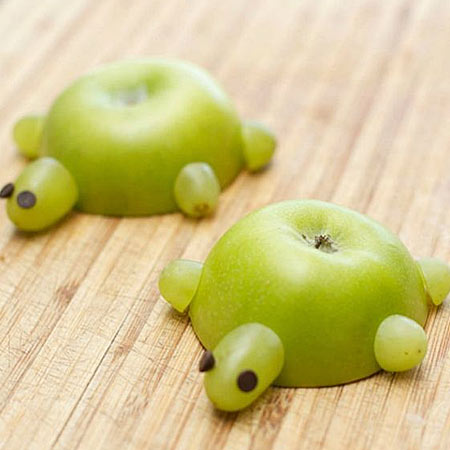 Κόψτε τα ξινόμηλα στη μέση και τοποθετήστε τα σε ένα πιάτο με το κομμένο μέρος προς τα κάτω. Έπειτα, πάρτε πέντε ρώγες σταφύλι, κόψτε τη μία άκρη τους και φτιάξτε ένα χελωνάκι.