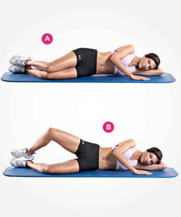 Ξαπλώστε πλάγια με τους γοφούς και τα γόνατα λυγισμένα σε γωνία 45 μοιρών. Κρατώντας τα πέλματα ενωμένα, σηκώστε το δεξί πόδι όσο πιο ψηλά μπορείτε. Κάντε μια στάση και έπειτα επιστρέψτε στην αρχική θέση. Το αριστερό πόδι θα πρέπει να μείνει όλη την ώρα σταθερό.
