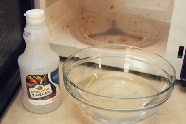 Σε ένα μπολ κατάλληλο για μικροκύματα ρίξτε ½ κούπα νερό και ½ κούπα λευκό ξύδι, μαζί με 1 ξύλινη οδοντογλυφίδα για λόγους ασφαλείας. Ζεστάνετε για 5-10 λεπτά, αναλόγως του πόσο βρώμικος είναι ο φούρνος σας. Όταν τον κλείσετε πάλι, περιμένετε 1-2 λεπτά, ώσπου να σταματήσει να βγαίνει ατμός απ’ το μπολ. Με τα γάντια σας, βγάλτε έξω το μπολ. Βουτήξτε ένα σφουγγάρι στο ζεστό διάλυμα και καθαρίστε τον φούρνο σας με ένα απλό πέρασμα.