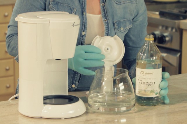Γεμίστε το δοχείο νερού της καφετιέρας με ένα ισόποσο μίγμα από νερό και λευκό ξύδι. Βάλτε την μπρος και κλείστε την όταν το νερό φτάσει στο μισό. Αφήστε την έτσι για 1 ώρα, ώστε να δράσει το ξύδι. Αμέσως μετά, ανοίξτε την πάλι και περιμένετε να περάσει όλο το νερό στην κανάτα. Λειτουργήστε την καφετιέρα 3 φορές ακόμη με σκέτο νερό και θα γίνει σαν καινούργια.