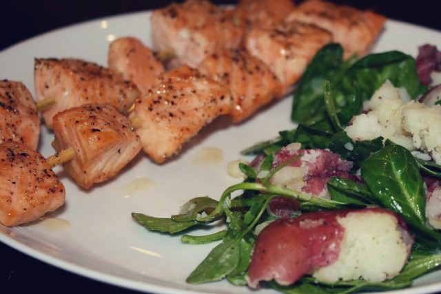Σουβλάκια σολωμού με πατάτες και σπανάκι