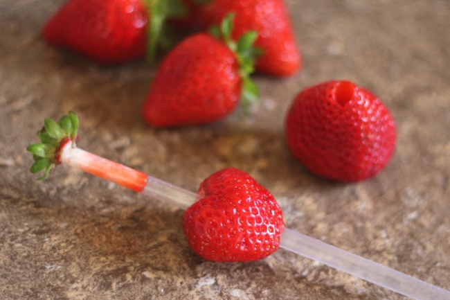 Το tip: Παίρνουμε ένα απλό καλαμάκι και το μπήγουμε αργά αργά στη φράουλα απ’ το κάτω μέρος. Ο λευκός κορμός και το κοτσάνι βγαίνουν έτσι από πάνω χωρίς να χαλάσει η φράουλα.