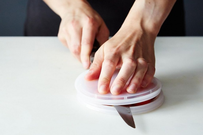 Το tip: Τοποθετούμε τη ντομάτα, ή όποιο άλλο παρόμοιο φρούτο θέλουμε να κόψουμε στη μέση, σε ένα πιάτο και την καπελώνουμε από πάνω με ένα άλλο πιάτο. Πιέζουμε το επάνω μέρος της σύνθεσης για να κρατήσουμε τη ντομάτα σταθερή και με το μαχαίρι μας κόβουμε ανάμεσα στα πιάτα.