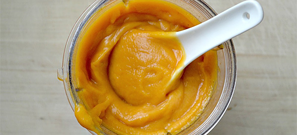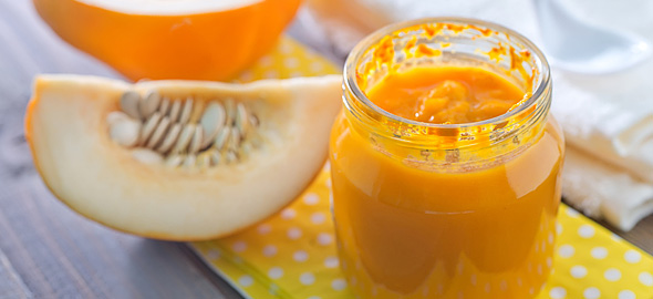 Μισό μήλο και μια μεγάλη φέτα κολοκύθας: Αφού βράσετε λίγο την κολοκύθα για να μαλακώσει, αφήστε την να κρυώσει και στη συνέχεια αναμείξτε τη στο μούλτι με το μήλο. Η γλυκιά γεύση και των δύο θα ενθουσιάσει το μωρό. Η δε κολοκύθα θεωρείται υπερτροφή για το μωρό, καθώς περιέχει αμέτρητες βιταμίνες (μεταξύ των οποίων Α,Β1,Β3,Β5,Β6 και C).